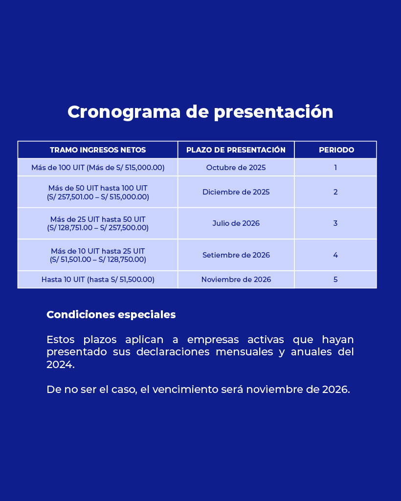 Mauricio Cavero-Blumenfeld, Socio en Aramburú, Castañeda, Boero – abogados, explica que la Resolución N° 168-2025/SUNAT fijó plazos escalonados entre octubre de 2025 y noviembre de 2026, según los ingresos netos de cada empresa.