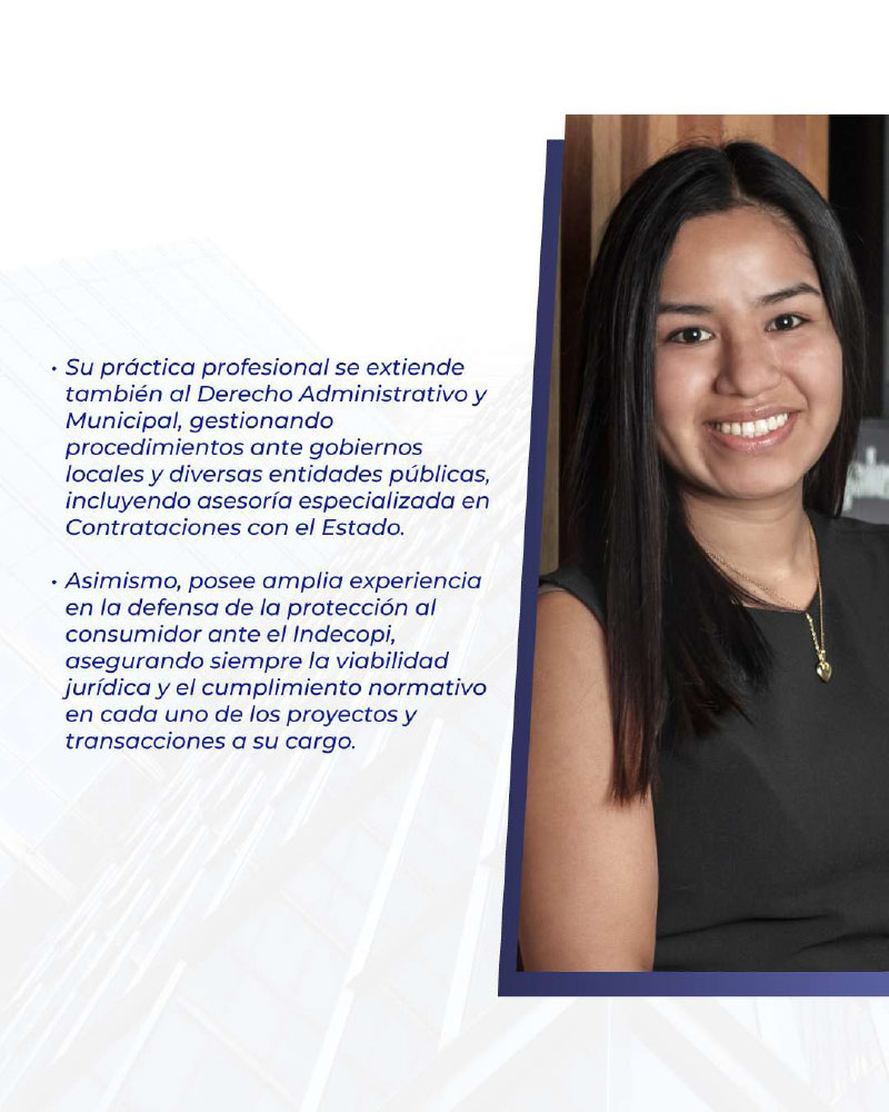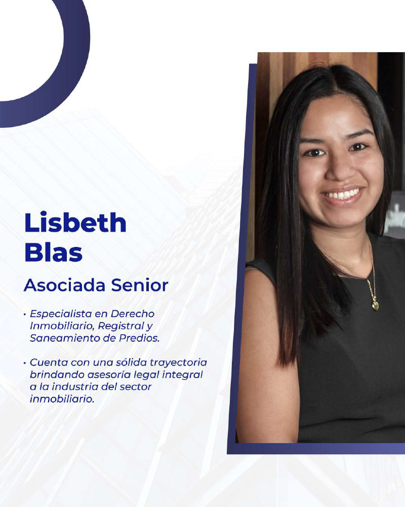 Te presentamos a nuestra Asociada Senior, Lisbeth Natalia Blas Infante, Magíster en Derecho de la Empresa por la Pontificia Universidad Católica del Perú.