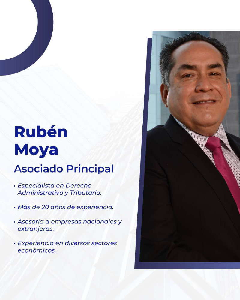Te presentamos a nuestro Asociado Principal, Ruben Moya, abogado por la Universidad Nacional Mayor de San Marcos, con estudios de Postgrado en Tributación por la Pontificia Universidad Católica del Perú.